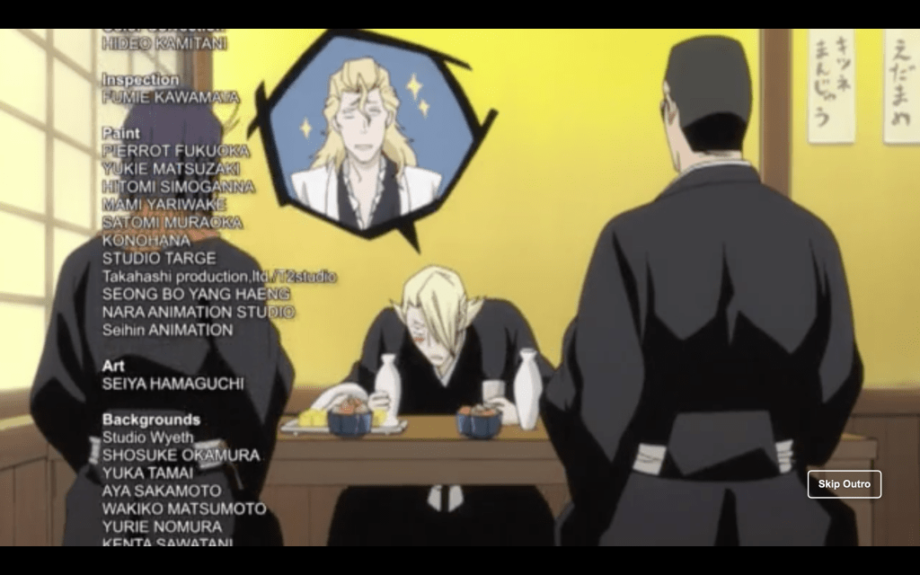 Now, Tetsuzaemon does have more interactions with Ikkaku, as the, however, that doesn’t mean he exclusively interacts with Ikkaku and Squad 7. He was one of several lieutenants to appear during the Fake Karakura Town arc to preserve the pillars. They do interact during the Thousand Year Blood War before Izuru’s absence. He and Izuru also have some interactions in things like the Shinigami Illustrated Picture Book segments, in and out of the Shinigami Men’s Association bits. It’s also safe to assume that they’ve probably grabbed drinks together too, since Izuru can be seen with Yumichika in an end credit and would get drinks with characters like Shuhei, Renji, and Rangiku.