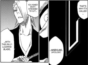 The way he describes Squad 3’s despair mantra has always stuck out to me. And it’s pretty suitable coming from him. His Zanpakuto, Wabisuke’s, ability doubles the weight of whatever it strikes, making it look like they’re bowing their head to apologize. And while wabisuke is also the name of a flower in the camellia family, the kanji for Wabi in Wabisuke shares the kanji 侘 for Wabishi (侘しい) and one version of Wabiru (侘び). This Wabiru is homonymous with Wabiru (詫び), which means “to apologize”.