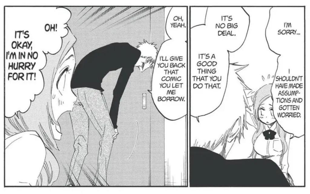 In terms of when I was initially reading the series, pat of this could be attributed to the fact that I had known that they got together in the end during my Bleach hiatus (I was spoiled, but since I had taken so long to finish it, I didn’t mind at the time). It could also have been due to the fact that I expected/didn’t mind that they could or would get together.